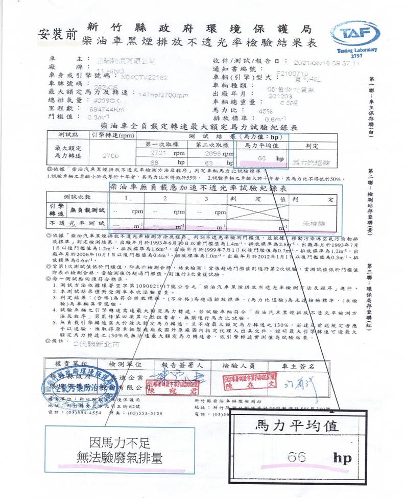此車原廠額定馬力為147hp,經檢驗馬力為66hp,低於規定的73.5hp。由於馬力不足無法進行廢棄排量檢驗。
