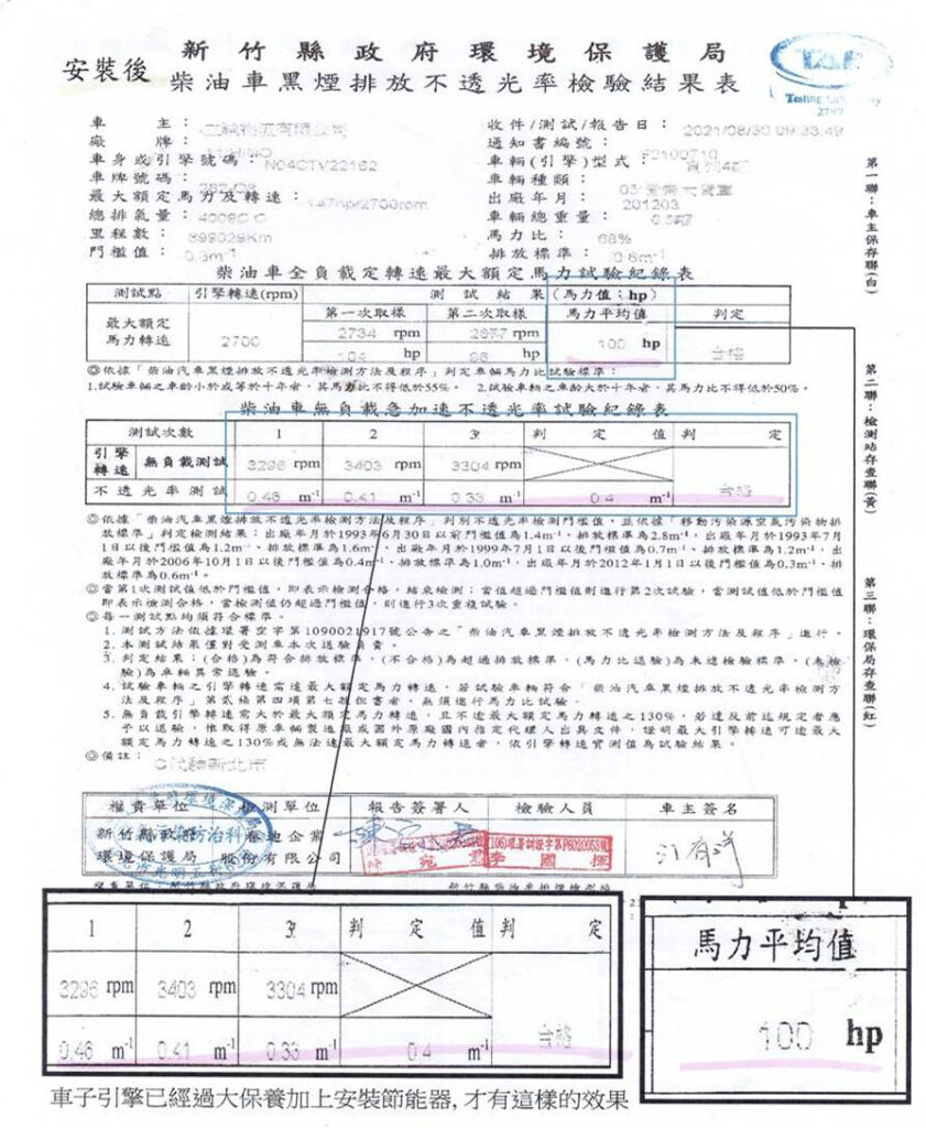 安裝本節油器後,馬力由 66hp提升至100hp,同時不透光率測試也判定合格。